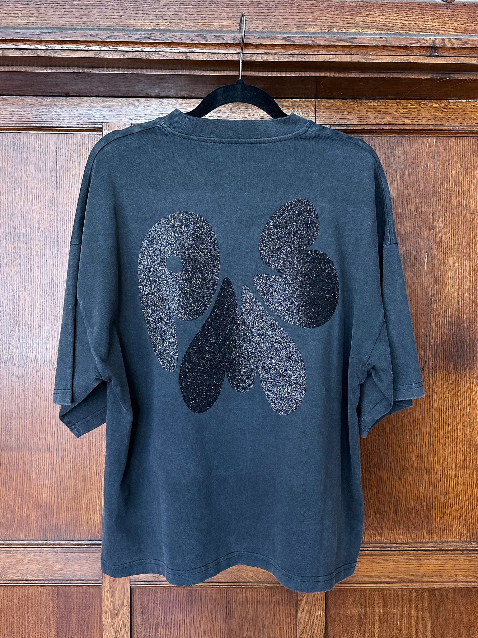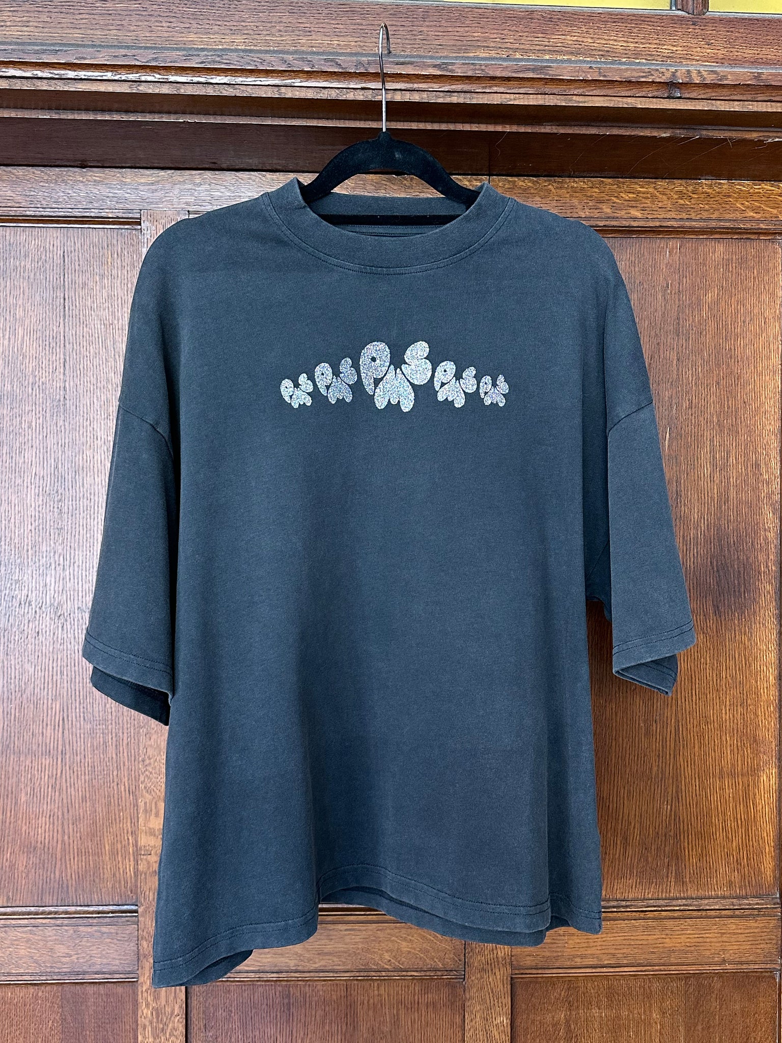 SILVER FRONT & BLACK GLITTER BACK ON WASHED BLACK T-SHIRT (FRONT AND BACK PRINT - BOXY FIT)